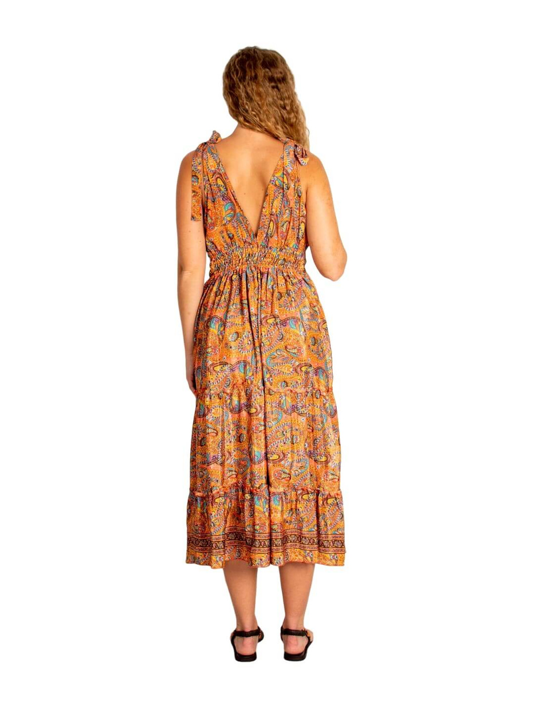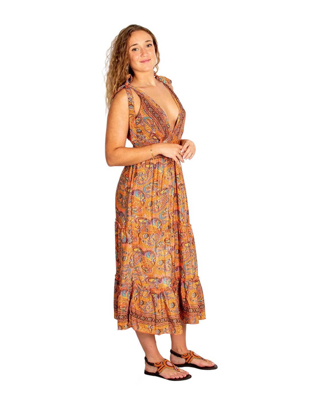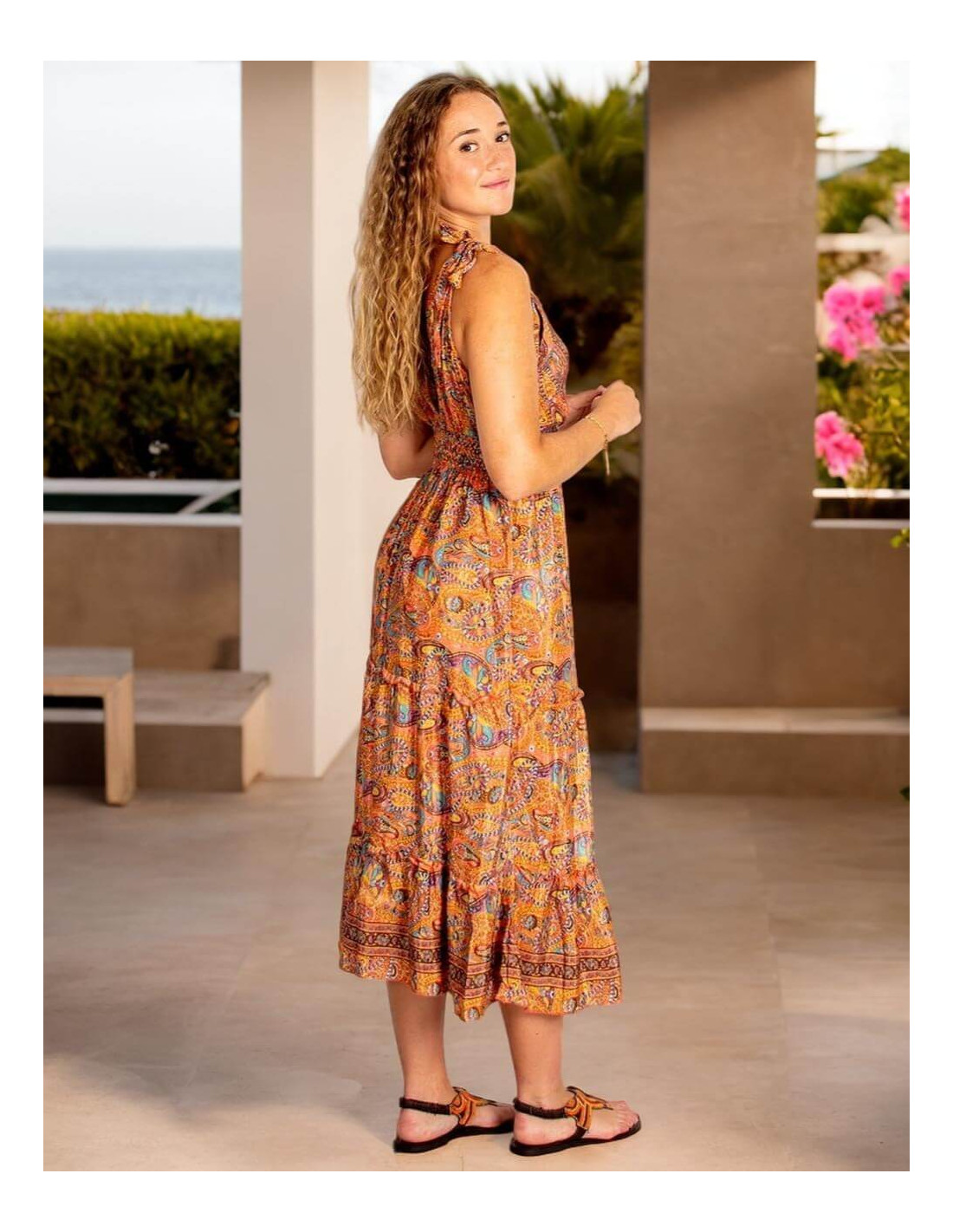 El vuelo del bajo con volantes añade un toque bohemio y femenino. Estampado sobre fondo naranja con dibujos en tonos azules, es ideal para quienes buscan un vestido hippie chic auténtico, único y cargado de cultura india. Medida: 129 cm aprox.